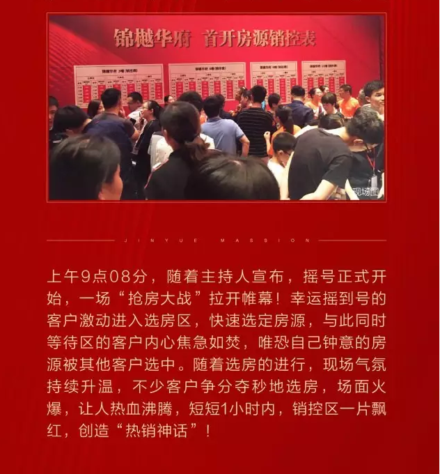 2017年(nián)8月(yuè)19日(rì),紹興華錦置業(yè)有(yǒu)限公司開¥↔¥(kāi)發的(de)“錦樾華府”樓盤首期93-145方多(duō)層電(diàn)梯∑§™€花(huā)園洋房(fáng)、高(gāo)開(kā¥★γi)高(gāo)走,開(kāi)盤不(bù)到(dào)一(yī±¶)個(gè)半小(xiǎo)時(shí),即告售馨,一(yī)登場(chǎn§∞g),即封藏。