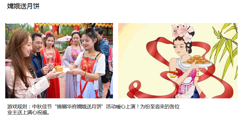 2018年(nián)8月(yuè)23日(rì)舉辦迎中秋、業(yè★↑)主生(shēng)日(rì)宴活動,活動內(nèi)容有(yǒu):月(yuè)餅DIY、娃娃機ו (jī)抓螃蟹、猜燈謎、嫦娥送月(yuè)餅、€δ生(shēng)日(rì)會(huì)